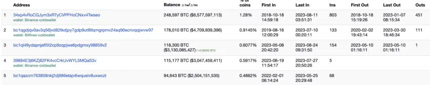 Acredita-se que cerca de 70% desse estoque esteja em carteiras frias. O restante parece estar distribuído entre as exchanges de criptomoedas Binance e BTC-W.