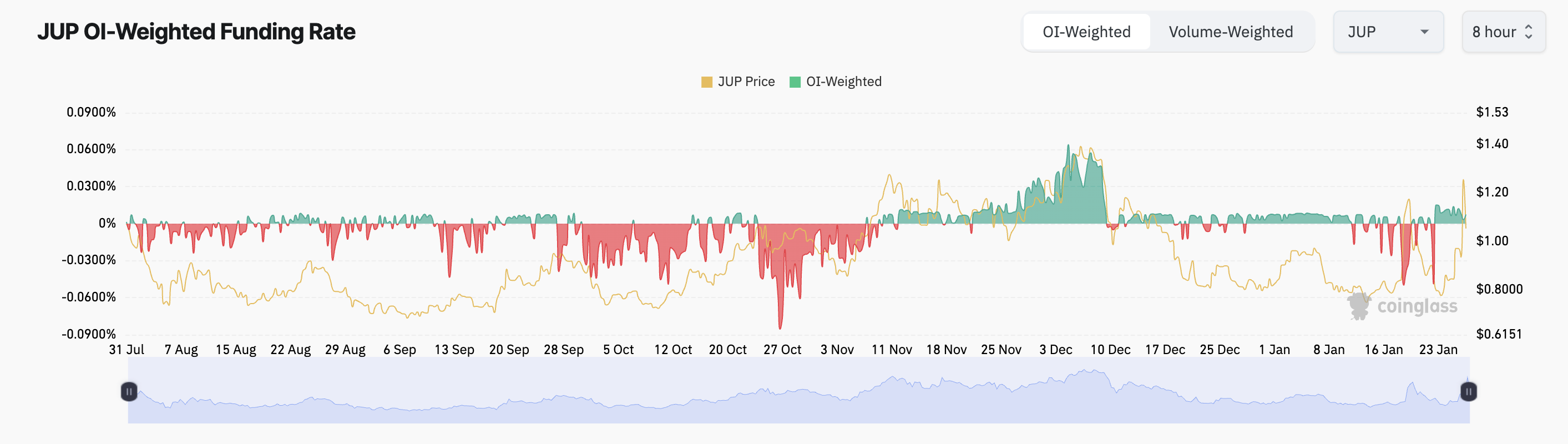 A taxa de financiamento é um pagamento periódico projetado para manter o preço do contrato próximo ao preço à vista do ativo subjacente. Como no caso da Jupiter, uma taxa de financiamento positiva significa que os detentores de posições longas estão pagando aos detentores de posições curtas, indicando forte sentimento de alta e maior demanda por posições longas no mercado.