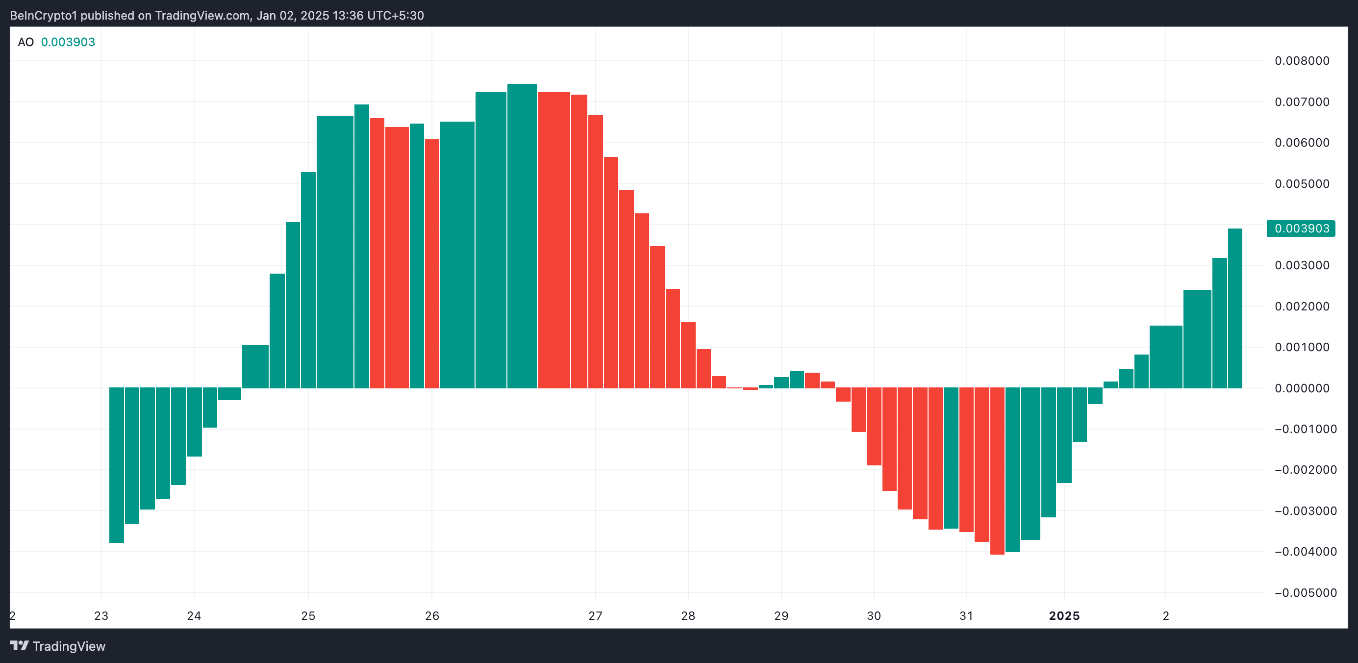 Além disso, leituras do Awesome Oscillator da PENGU observadas em um gráfico de quatro horas confirmam essa perspectiva otimista. No momento desta publicação, o indicador de momento exibe uma barra de histograma verde com valor de 0.0039.