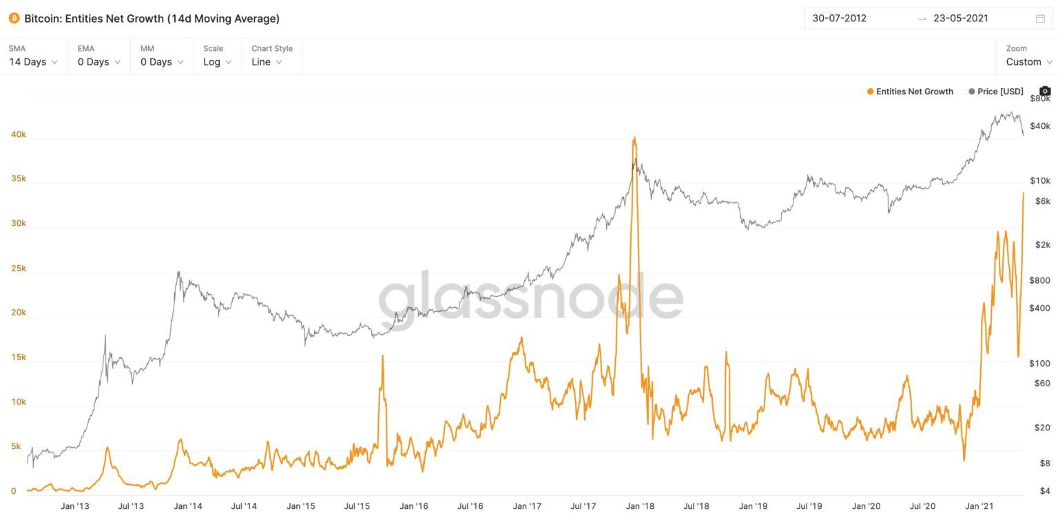 Em comparação com os picos de bolha dos ciclos anteriores, esse comportamento é inesperado. Tanto em 2013 quanto em 2017, o pico do BTC levou a um declínio dramático na taxa de crescimento de seu usuários.