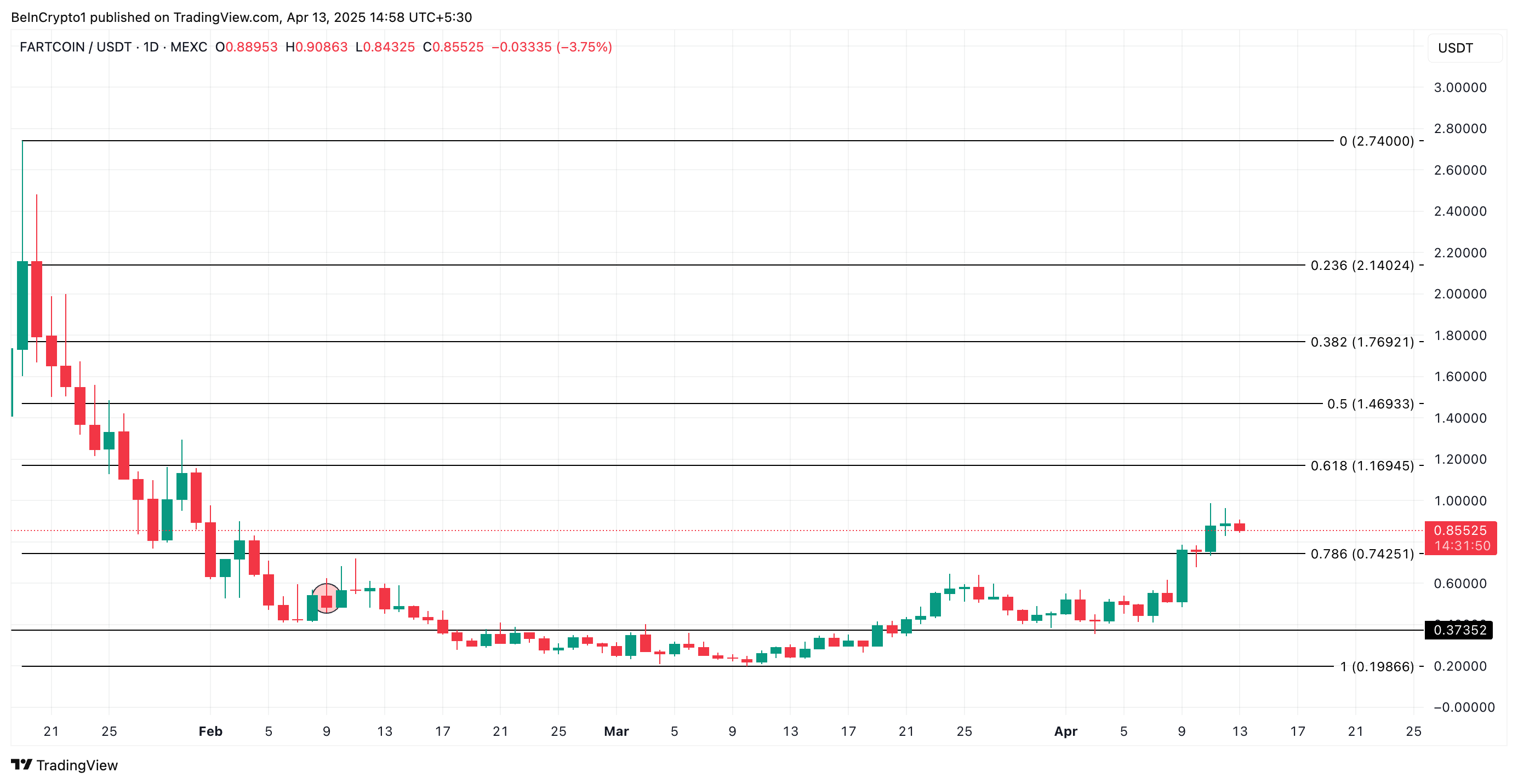 Esse padrão sugere que o preço atual da FARTCOIN pode não ser sustentável, aumentando a probabilidade de uma retração no curto prazo.