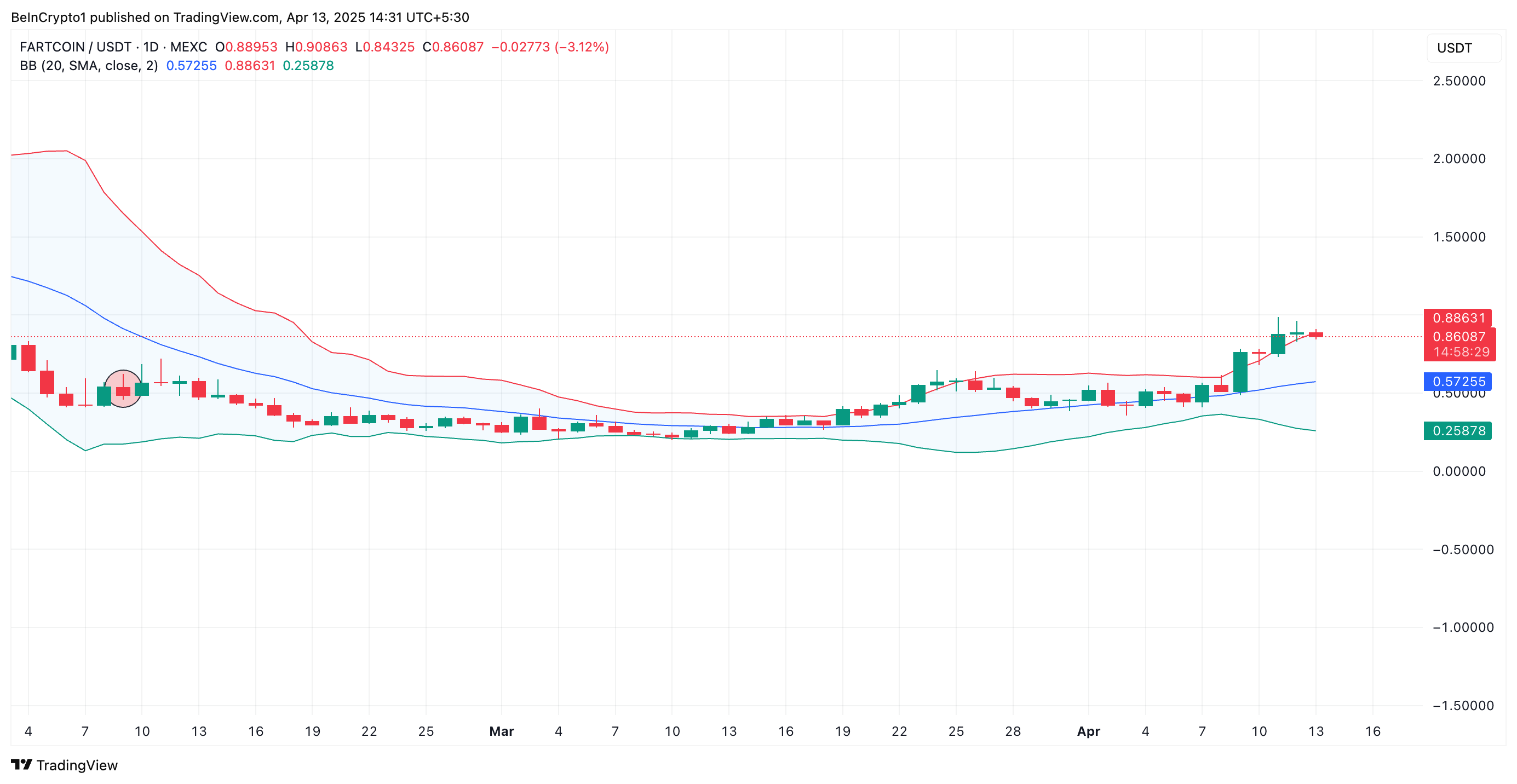 A alta de três dígitos da FARTCOIN elevou seu preço acima da banda superior do indicador Bollinger Bands (BB), um sinal de que a memecoin está sobrecomprada.