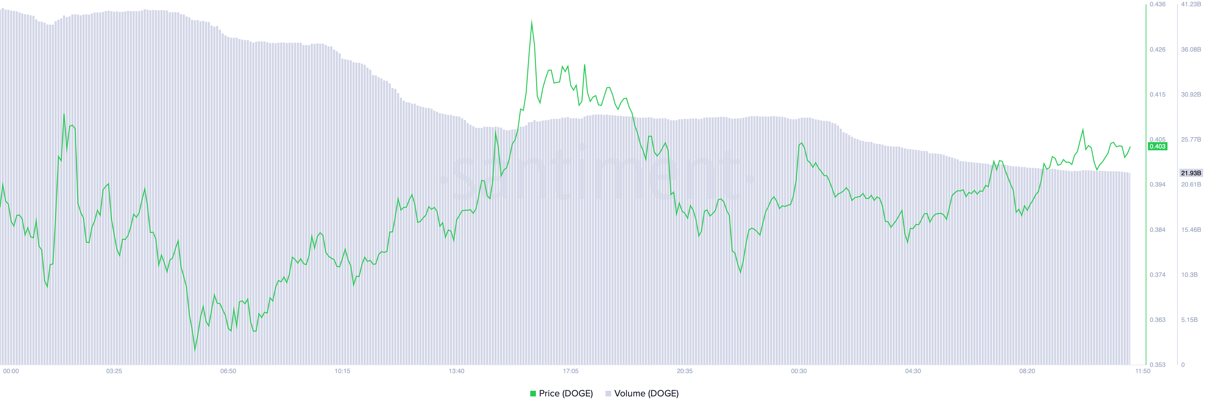 O preço da Dogecoin subiu 7% nas últimas 24 horas. No entanto, durante o mesmo período, o volume de negociação diminuiu 33%, confirmando o aumento gradual nas vendas da memecoin.