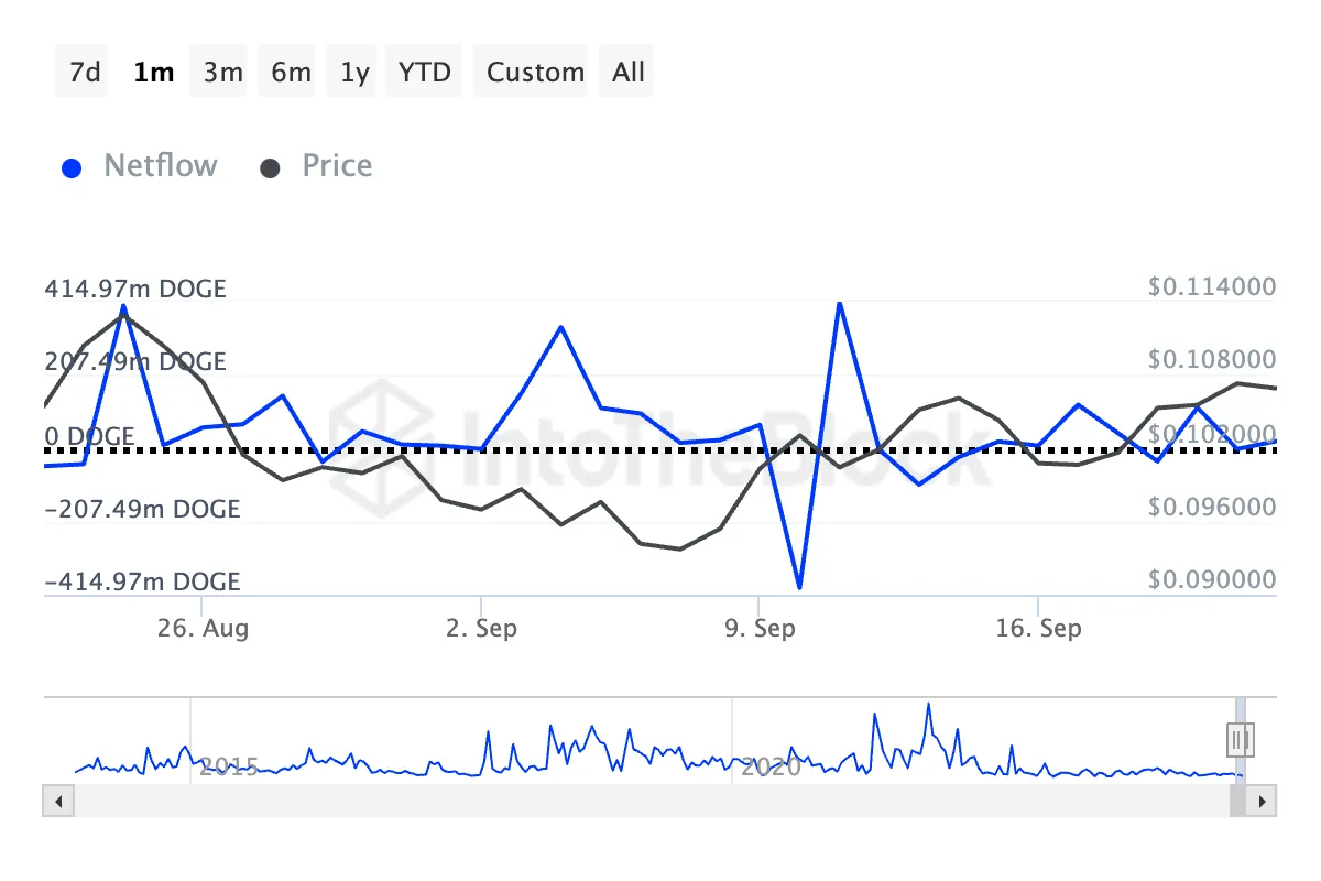 Apesar das melhorias no mercado cripto mais amplo e menos vendas por parte dos traders de DOGE, essa resistência permanece intacta. Notavelmente, as baleias aumentaram sua acumulação ao longo do último mês, conforme visto no aumento do fluxo líquido dos grandes detentores.