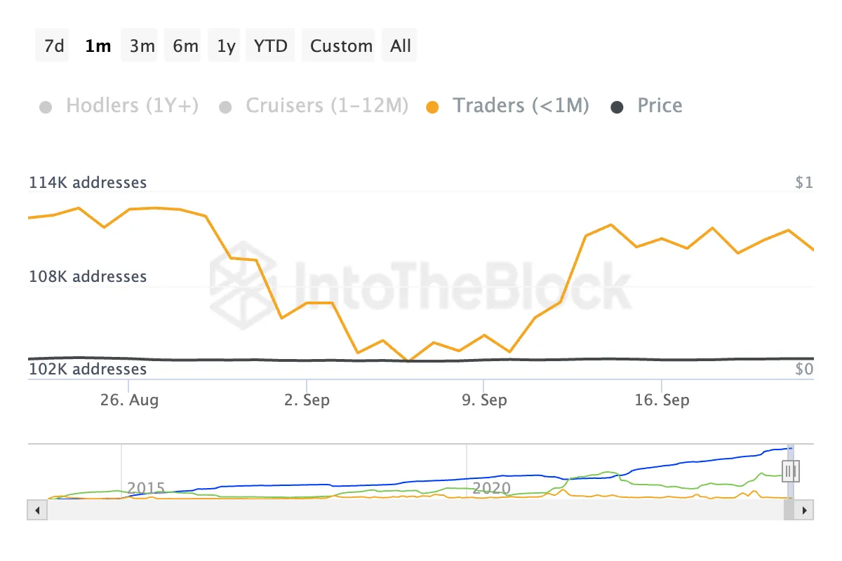 Contudo, o movimento lateral do preço deixou os traders varejistas desanimados. Enquanto as baleias aumentaram sua acumulação, os traders varejistas — aqueles que mantêm moedas por menos de 30 dias — venderam parte de suas posições ao longo do último mês.