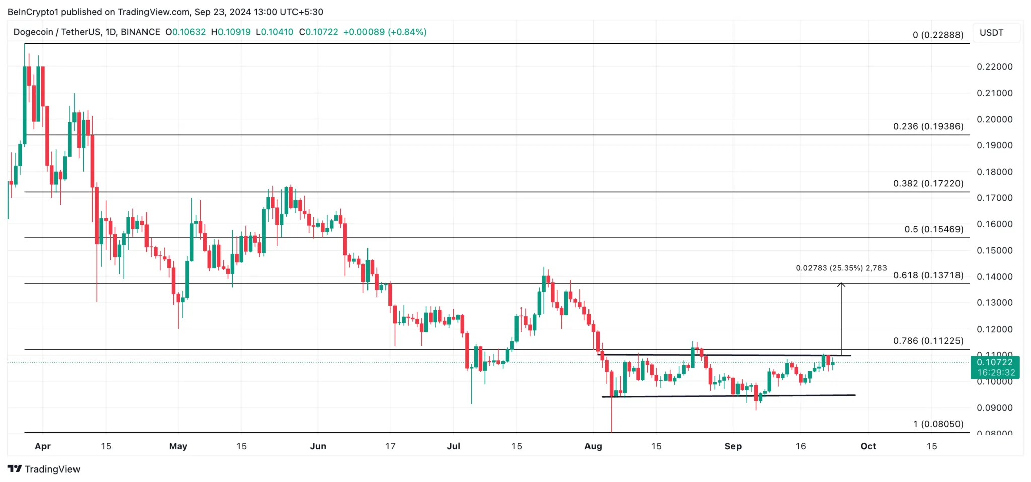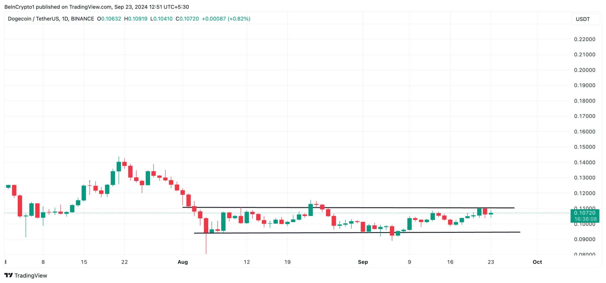 A Dogecoin está negociada dentro de um canal horizontal desde 4 de agosto. O equilíbrio entre as pressões de compra e venda manteve seu preço limitado por mais de 30 dias.