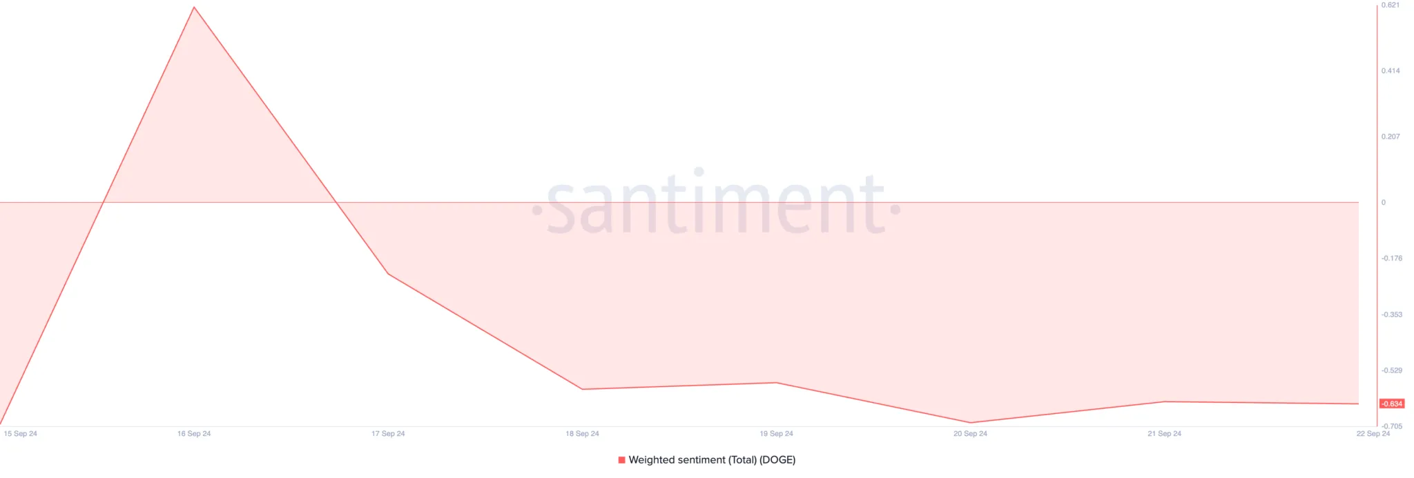 Para que o preço da Dogecoin ultrapasse US$ 0,11 com sucesso, o sentimento do mercado precisa melhorar. Atualmente, o sentimento ponderado da criptomoeda meme, que rastreia o humor do mercado geral em relação a ela, está em -0,63 e tem sido negativo desde 18 de setembro.