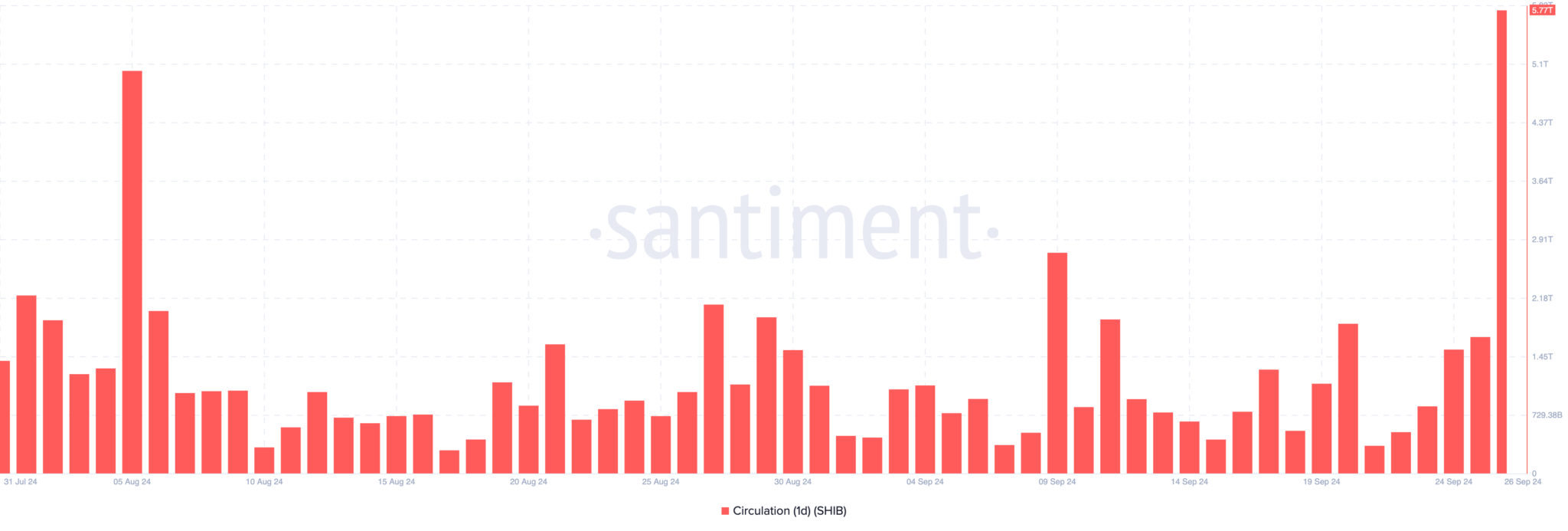Dados da Santiment mostram que a circulação diária da SHIB atingiu 5,77 trilhões na quinta-feira (26). Este é o maior valor registrado em 10 semanas.