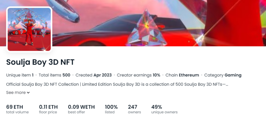A Limited Edition Soulja Boy 3D NFTs é composta por 500 tokens, criados na blockchain Ethereum (ETH). A coleção promete acessos exclusivos no próximo jogo Soulja Boy 3D Meta e outras vantagens exclusivas para os seus detentores.
