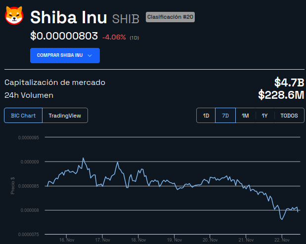 A SHIB, token nativo do ecossistema Shiba Inu, passou por dias dramáticos. No momento da publicação, seu preço era negociado a US$ 0,00000803 após cair 4% nas últimas 24 horas.