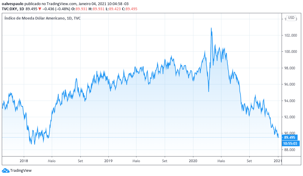 A aposta na queda do dólar se confirmou logo em seguida. O índice DXY, que mede a força da moeda contra uma cesta de divisas fortes, caiu para menos de 89,5 pontos, o menor patamar desde 1º de abril, no auge da crise do coronavírus. O recuo do câmbio no Brasil para R$ 5,18 no fechamento do ano, portanto, foi influenciado pelo fator externo.