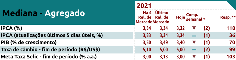 Ainda segundo o relatório do Banco Central, operadores do mercado projetam Selic em 3% para 2021. A taxa é menor do que a prevista na última semana, quando a expectativa era de taxa base em 3,13%. O movimento vem acompanhado de inflação alta medida pelo IPCA, mas em queda.