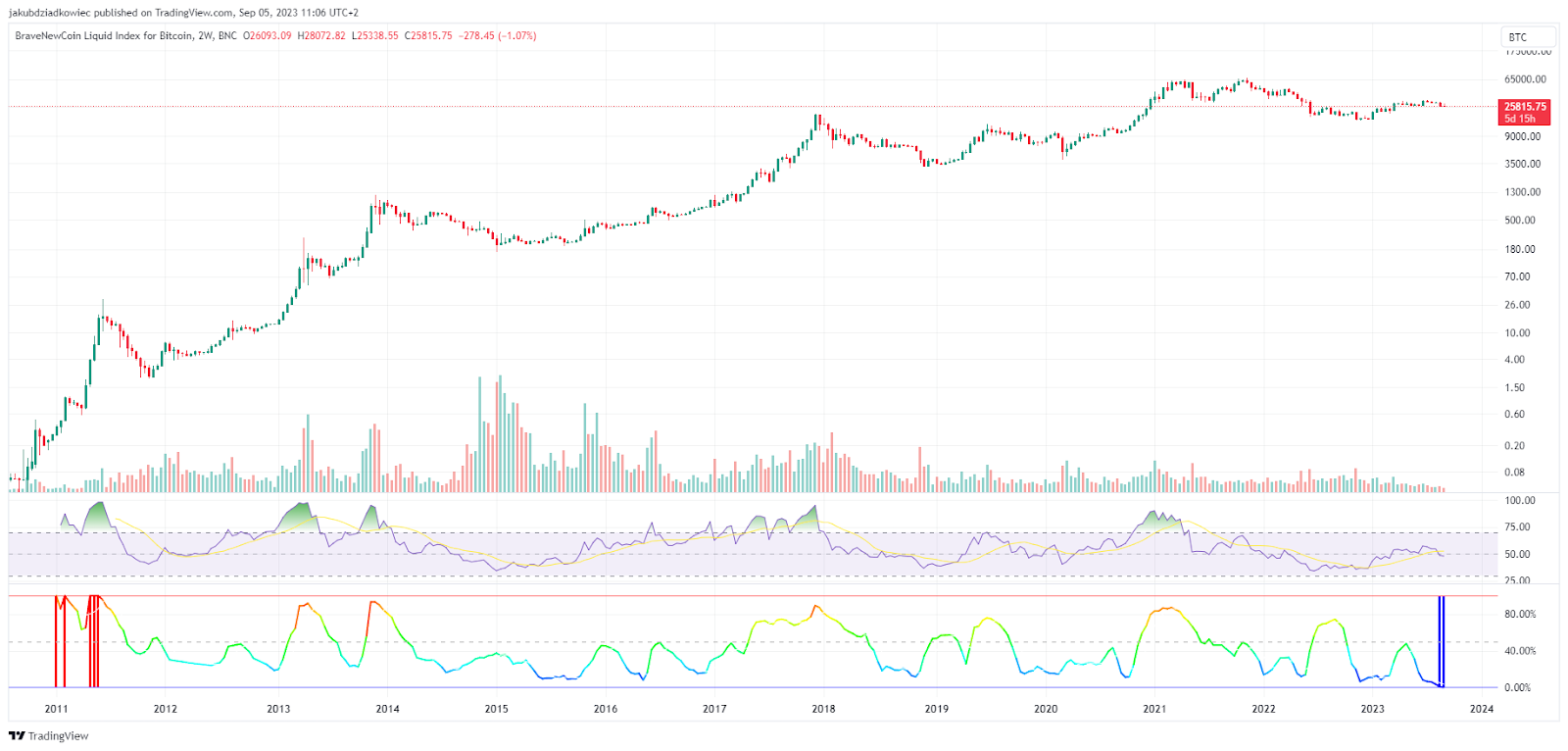 Outro conhecido analista de longo prazo @el_crypto_prof apontou ontem a volatilidade extremamente baixa do Bitcoin em intervalos de tempo elevados. Em um tweet que publicou, ele destacou o indicador BBWP (Bollinger Band Width Percentile) para o gráfico de 2 semanas do BTC.