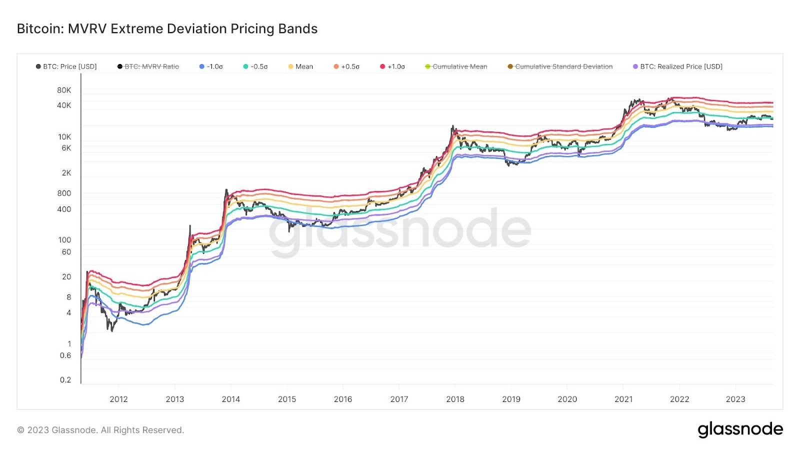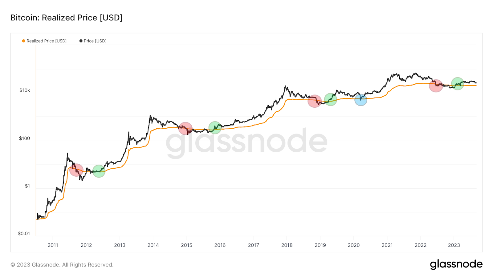 Então, vemos que o evento oposto – o rompimento do preço do BTC acima do preço realizado (círculos verdes) – iniciou um mercado altista de longo prazo. A partir de então, o preço do Bitcoin (raramente) caiu abaixo do preço realizado até o final do mercado baixista do próximo ciclo.