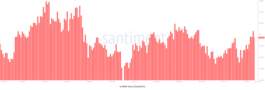 O aumento do preço da Polygon em 15 de julho melhorou a rentabilidade, já que o índice MVRV de 30 dias subiu para 1,87%. No entanto, a retração forçou o índice a voltar para 2,05% na atualidade.
