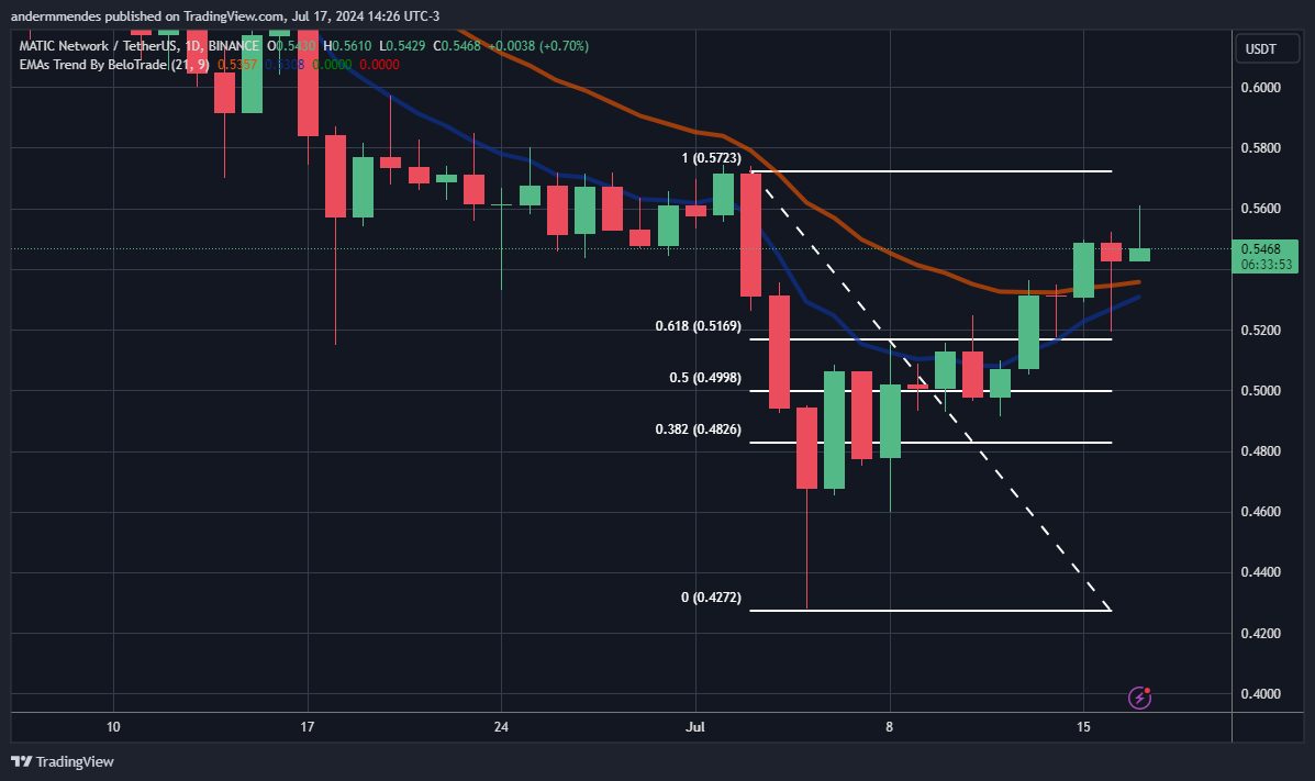 O gráfico diário mostra que a MATIC está em tendência de alta desde a última sexta-feira (5), quando atingiu uma mínima de US$ 0,42. Inicialmente, o movimento era visto como uma correção da tendência de baixa que estava em vigor, mas o rompimento do nível de retração de 0,618 colocou em cheque este cenário.