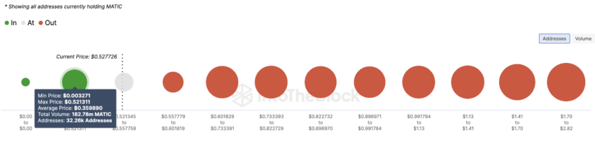 Na semana passada, a MATIC caiu para US$ 0,48, após um longo período em que o preço despencou de seus máximos em março. A consequência dessa ação é indicada pelo Global In/Out of Money (GIOM). O GIOM classifica os endereços com base nos que estão lucrando com a ação do preço atual, nos que estão perdendo dinheiro e nos que estão no ponto de equilíbrio.
