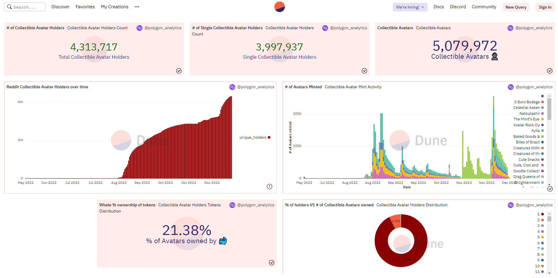 A iniciativa baseada em Polygon é um dos raros casos de sucesso em meio a turbulência do mercado cripto mais amplo e a queda no volume de vendas de NFT. O Reddit Collectible Avatars NFT ultrapassou a marca de 5 milhões de acordo com dados coletados na plataforma de análise on-chain Dune.