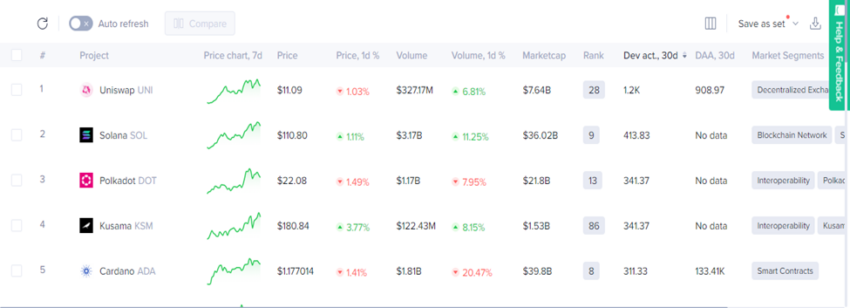 Sua rede está atrás da Kusama (KSM), Polkadot (DOT), Solana (SOL) e Uniswap (UNI) com aproximadamente 311,33 em atividade de desenvolvimento durante todo o mês de março.