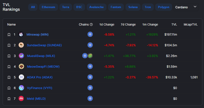 A Cardano tem sete dApps que contribuem para o seu valor bloqueado na forma de exchanges descentralizadas (MiniSwap, ADAX Pro, MuesliSwap, SundaeSwap e MeowSwap), bem como Meld e VyFinance.