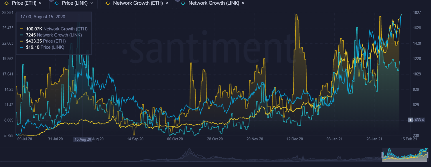 O crescimento simultâneo da rede, representado pelo número de novos endereços diários criados, apoia essa narrativa otimista. No dia 8 de fevereiro de 2021, o número de novas carteiras diárias nas redes Ethereum e Chainlink era superior a 163.000 e 6.700, respectivamente.
