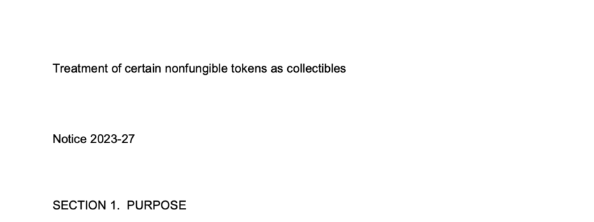 A Receita Federal dos EUA expõe em documento que busca emitir orientação para o tratamento tributário de “certos NFTs”, como colecionáveis que pertencem à Seção 408, e se concentraria na inclusão de NFTs de coleções particulares, mas não de metaversos ou endossos de parcelas de terrenos virtuais.