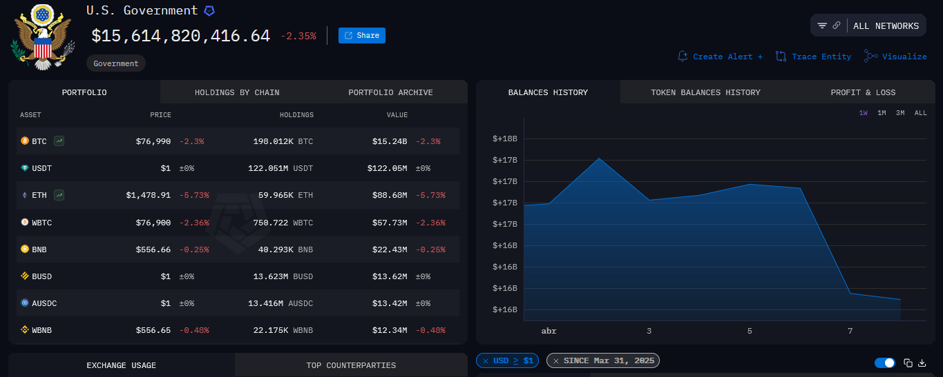 Segundo dados da Arkham Intelligence, o valor das reservas de Bitcoin (BTC) sob custódia do governo norte-americano registrou uma queda de 12% entre os dias 2 e 8 de abril, recuando de US$ 17,24 bilhões para US$ 15,21 bilhões.