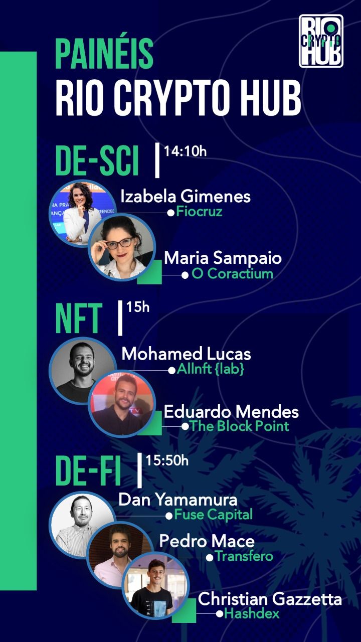 Serão 3 painéis com foco em NFT, DeFi e De-SCi com informações para entusiastas, desenvolvedores, construtores e curiosos sobre a web3