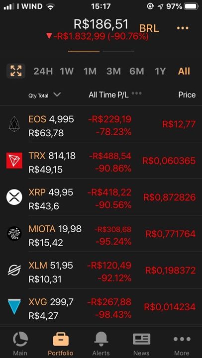 Teve gente que comprou algumas unidades de Ripple (XRP) a quase R$ 10. O impressionante valor corresponde a uma outra época para esta altcoin. Além dela, outros investimentos do usuário parecem não ter dado resultado algum além de um enorme prejuízo.