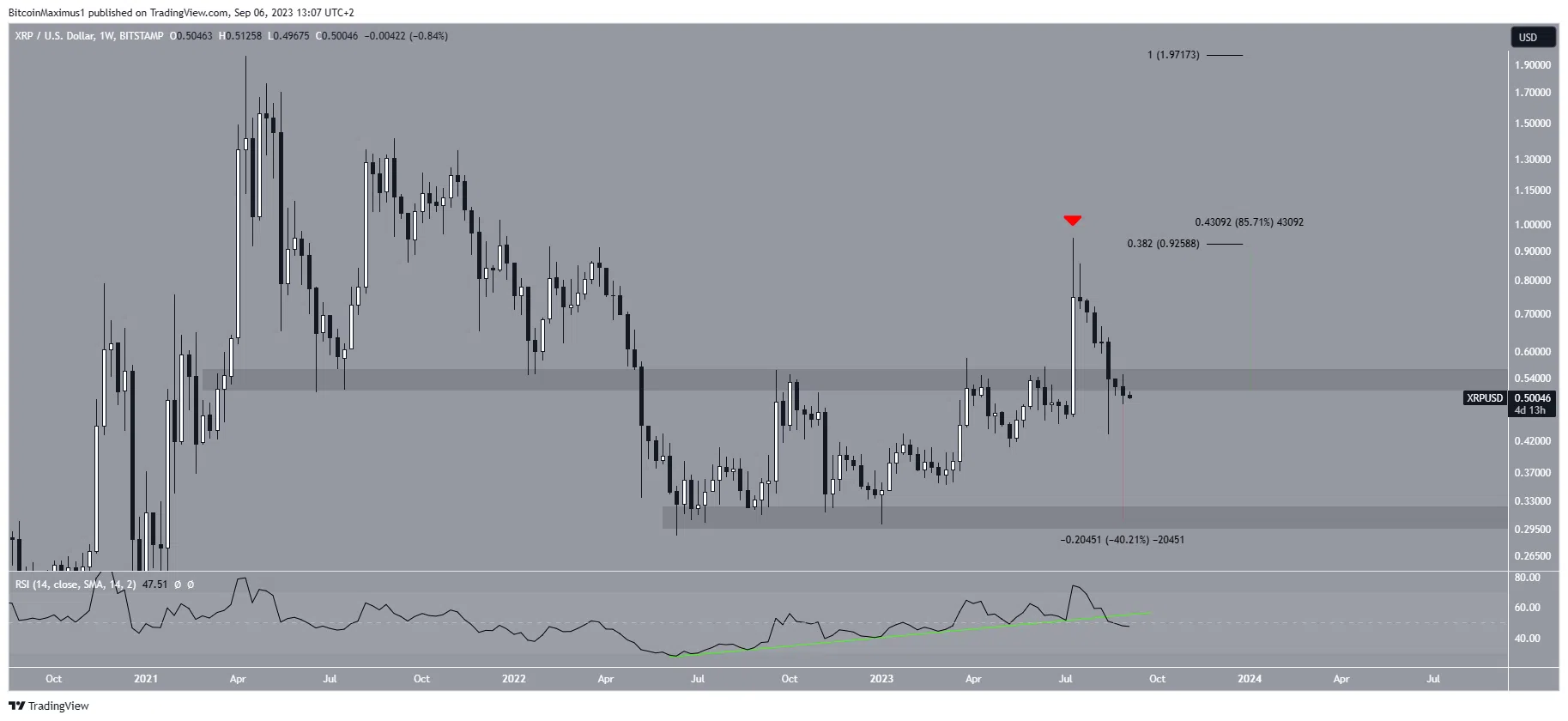 A análise técnica semanal da XRP fornece uma perspectiva de baixa. Isso se deve tanto à ação do preço quanto às leituras do RSI.