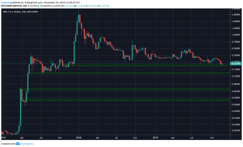 Observando o preço logarítmico do XRP, podemos ver que o preço está atualmente dentro de uma área de suporte forte em US $ 0,22.