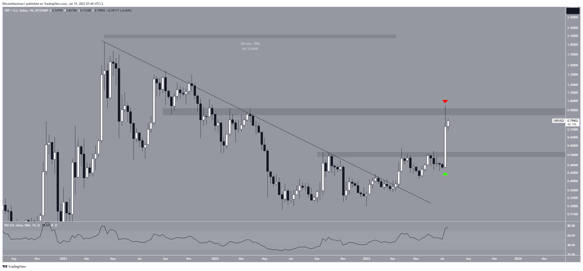 Após o rompimento, a XRP moveu-se acima da área horizontal de US$ 0,54, criando uma grande vela de alta (ícone verde). Isso levou o preço à próxima resistência em US$ 0,90, que foi rejeitada na mesma semana (ícone vermelho). A XRP agora está sendo negociada entre esses dois níveis.