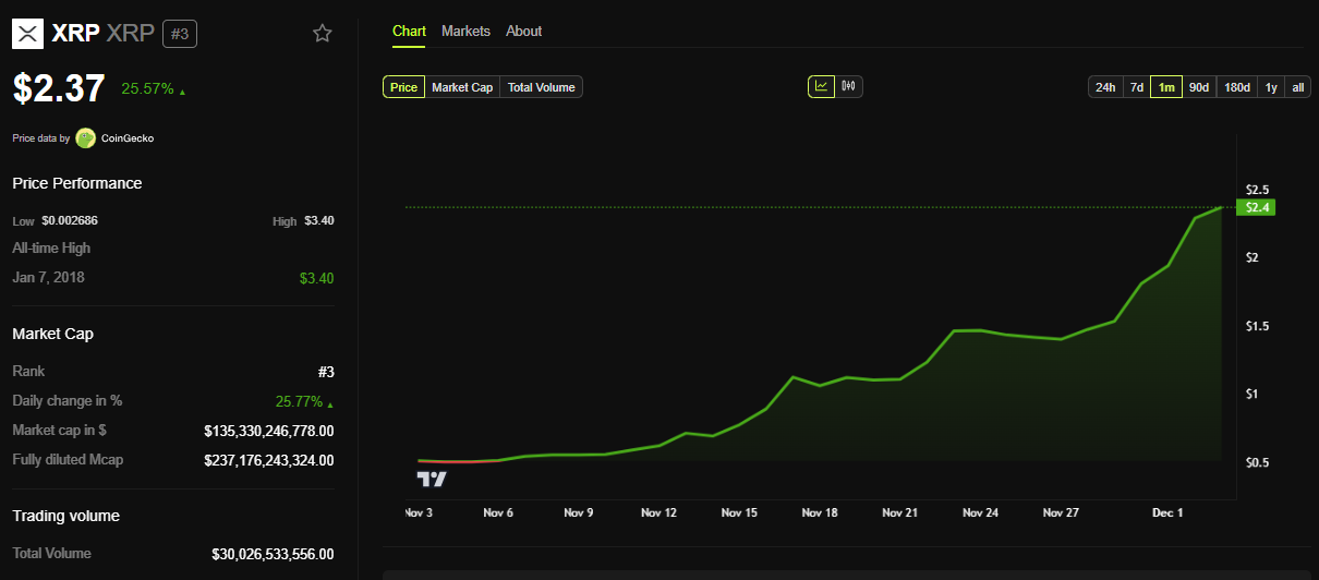 O XRP era negociado a US$ 2,37 no momento da redação desta matéria, um aumento impressionante de 25,57% desde a abertura da sessão de segunda-feira (2).
