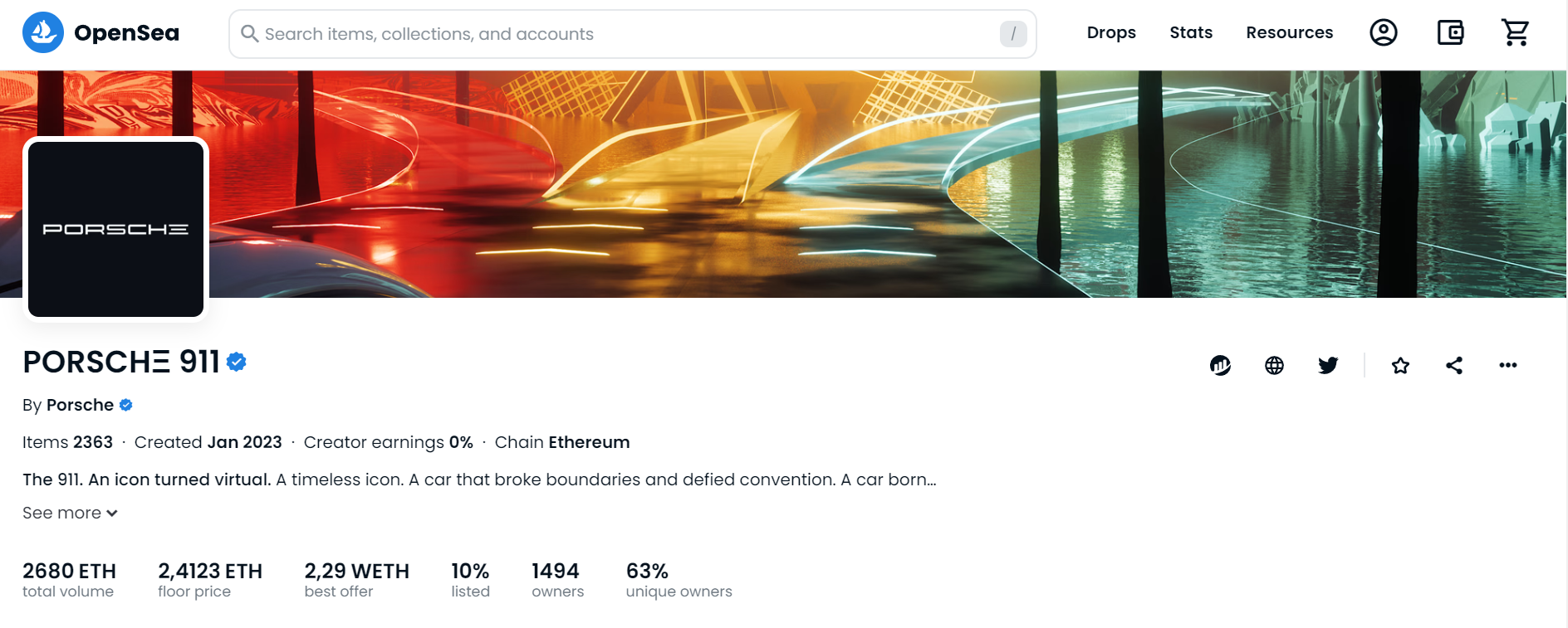 A coleção Porsche foi lançada no dia 23 de janeiro, com 7.500 NFTs ao custo de 0,911 ETH e foi um fracasso total. Apenas 1.494 foram mintados no dia do lançamento. E olha que o modelo do carro digital 911 dos colecionáveis é um dos mais famosos da marca de carros de luxo.