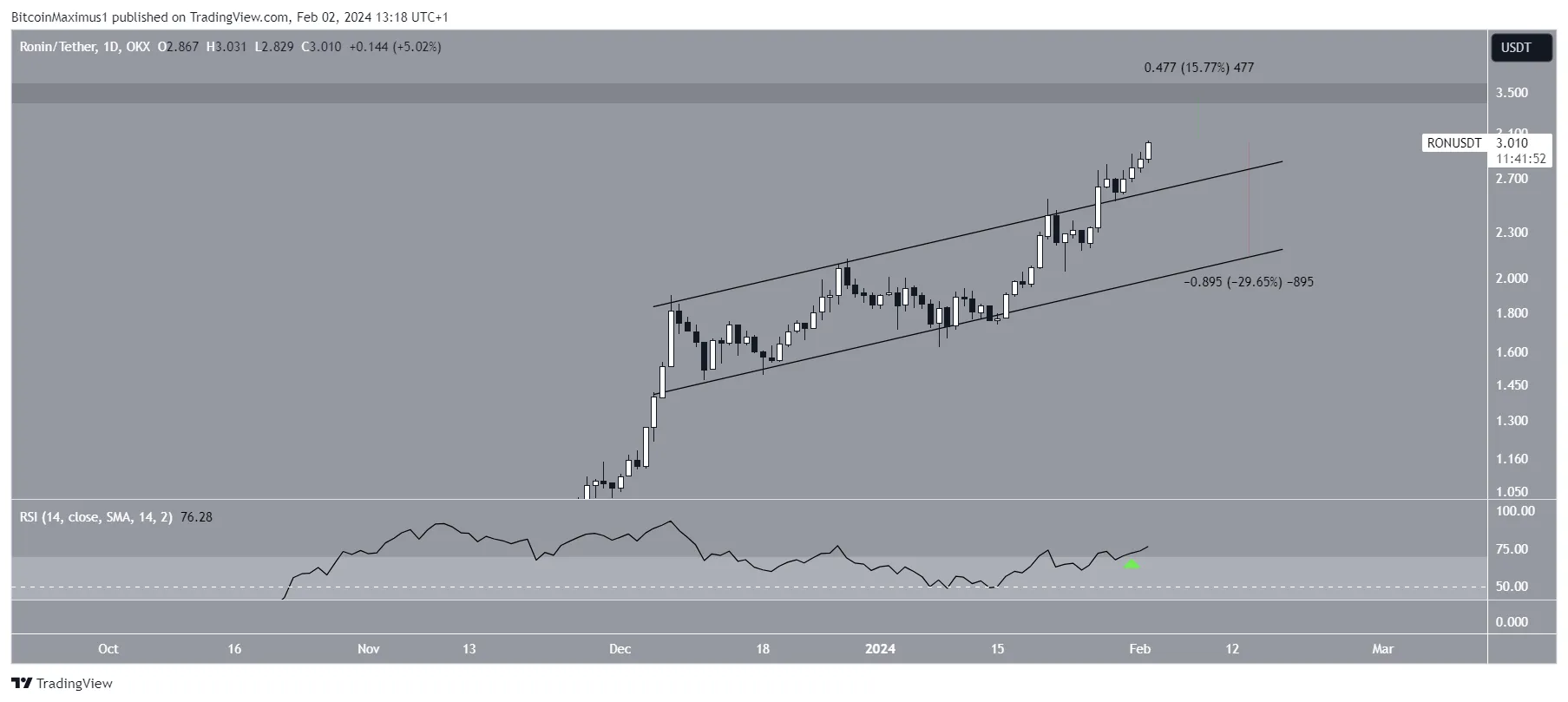 A razão para a alta recente pode ter ocorrido depois que a Coinbase anunciou que havia adicionado o RON a sua plataforma. Além disso, o RSI diário está subindo (ícone verde) e passou para território de sobrecompra.