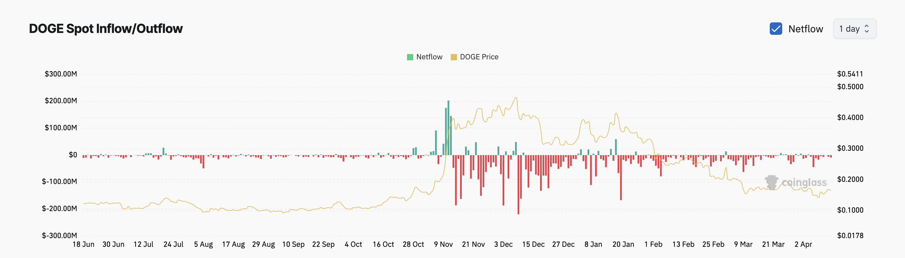 Desde o início de abril, DOGE tem registrado um fluxo constante de saídas líquidas de seu mercado à vista, totalizando mais de US$ 120 milhões. As entradas líquidas no mesmo período foram insignificantes, somando menos de US$ 5 milhões, segundo a Coinglass.