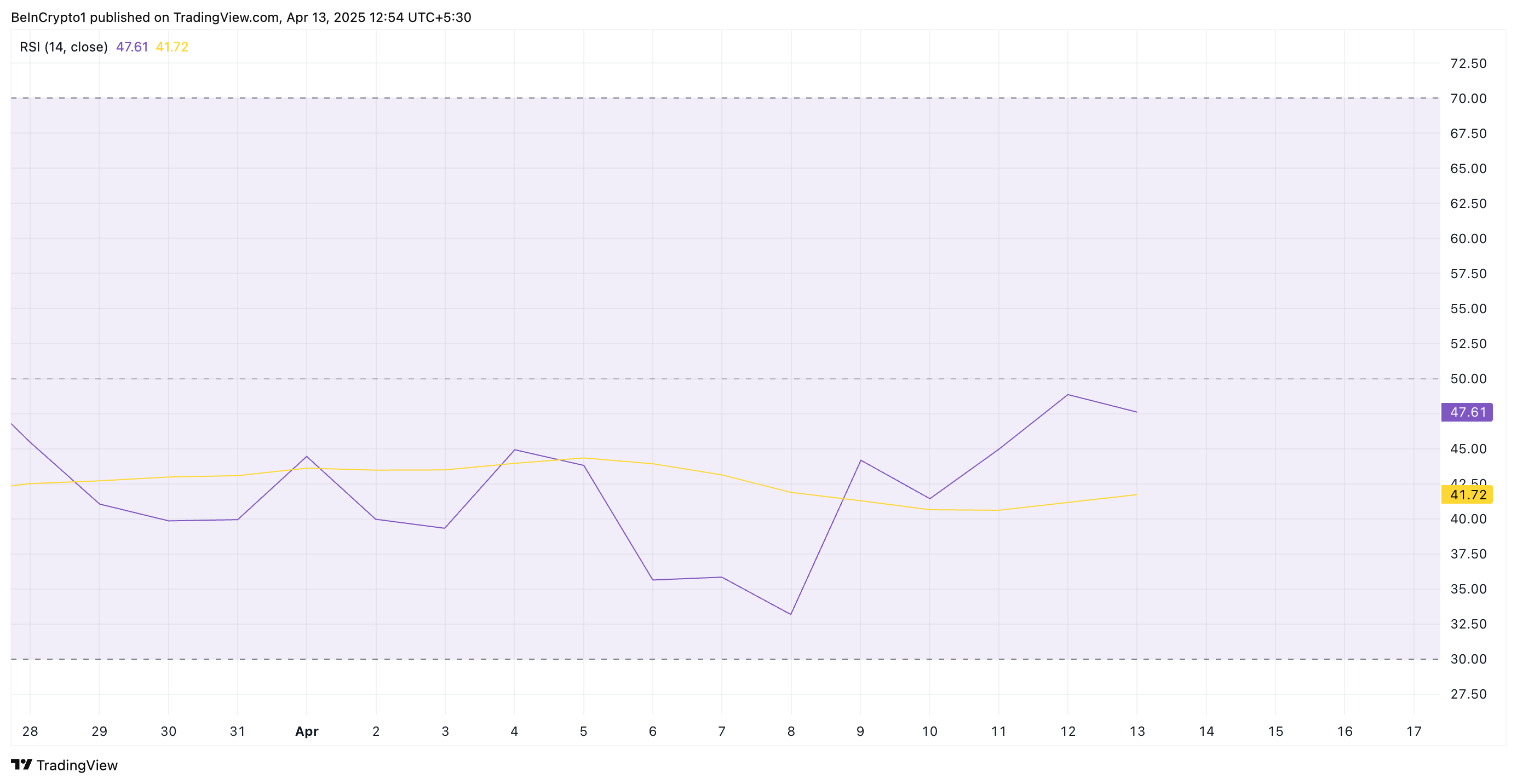 No momento da publicação, este indicador de momento chave, que mede as condições de mercado sobrevendidas e sobrecompradas de um ativo, está abaixo da linha neutra de 50, em 47,61.