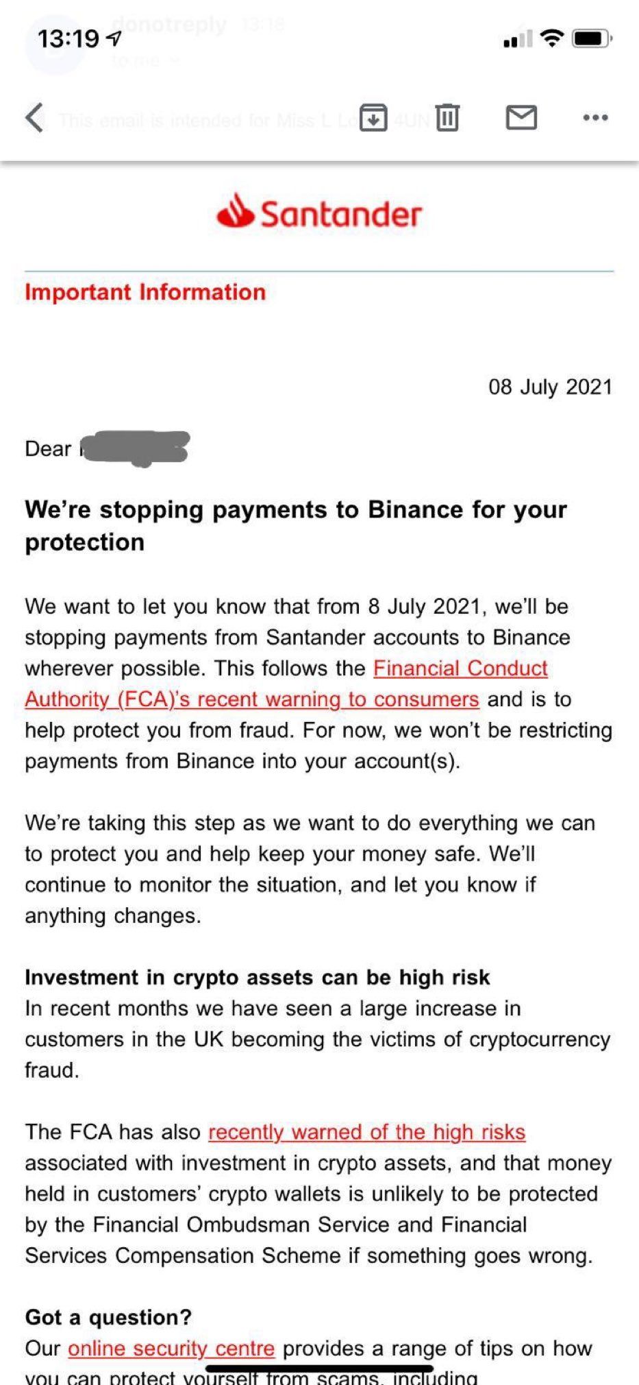 Em resposta a um cliente, o Santander disse que a interpretação da instituição é que o alerta afeta também a Binance.com, já que a FCA teria advertido o Binance Group como um todo.