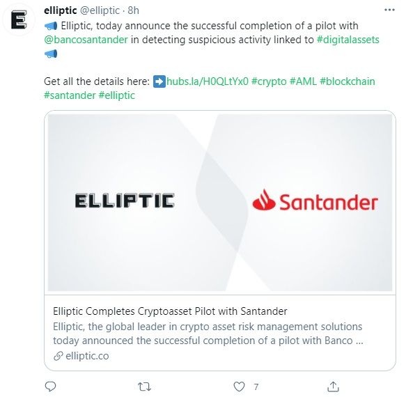 De acordo com o comunicado oficial da Elliptic publicado nesta terça-feira (22), o piloto feito com o Santander se concentrou na avaliação de risco em transações envolvendo criptomoedas.