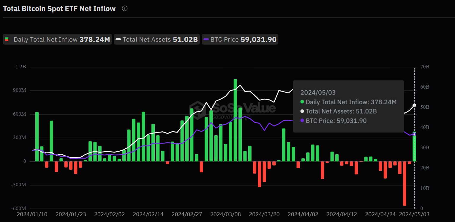 Após sete dias de saídas consecutivas, o mercado testemunhou uma entrada impressionante. Um total de US$ 378,24 milhões fluíram para ETFs de Bitcoin, negociados nos EUA em 3 de maio.