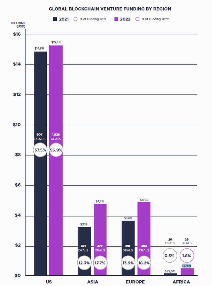 O investimento de capital de risco em criptomoedas cresceu mais de 400% na África em 2022. O valor total investido foi de US$ 470 milhões.