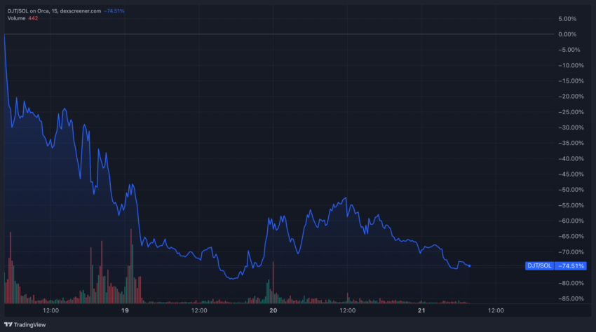Esta semana, a moeda meme DJT, supostamente ligada a Donald Trump e seu filho Barron, chamou a atenção da comunidade cripto depois de subir 1.450% devido a postagens especulativas. No entanto, a moeda posteriormente despencou quase 75% em meio ao drama que se desenrolava.