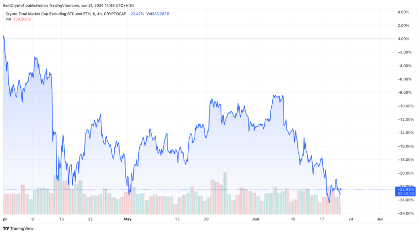 Desde março, a capitalização total do mercado cripto, excluindo Bitcoin e Ethereum (ETH), diminuiu 22,42%. Isso significa que todas as outras criptomoedas, exceto Bitcoin e Ethereum, estão enfrentando dificuldades.