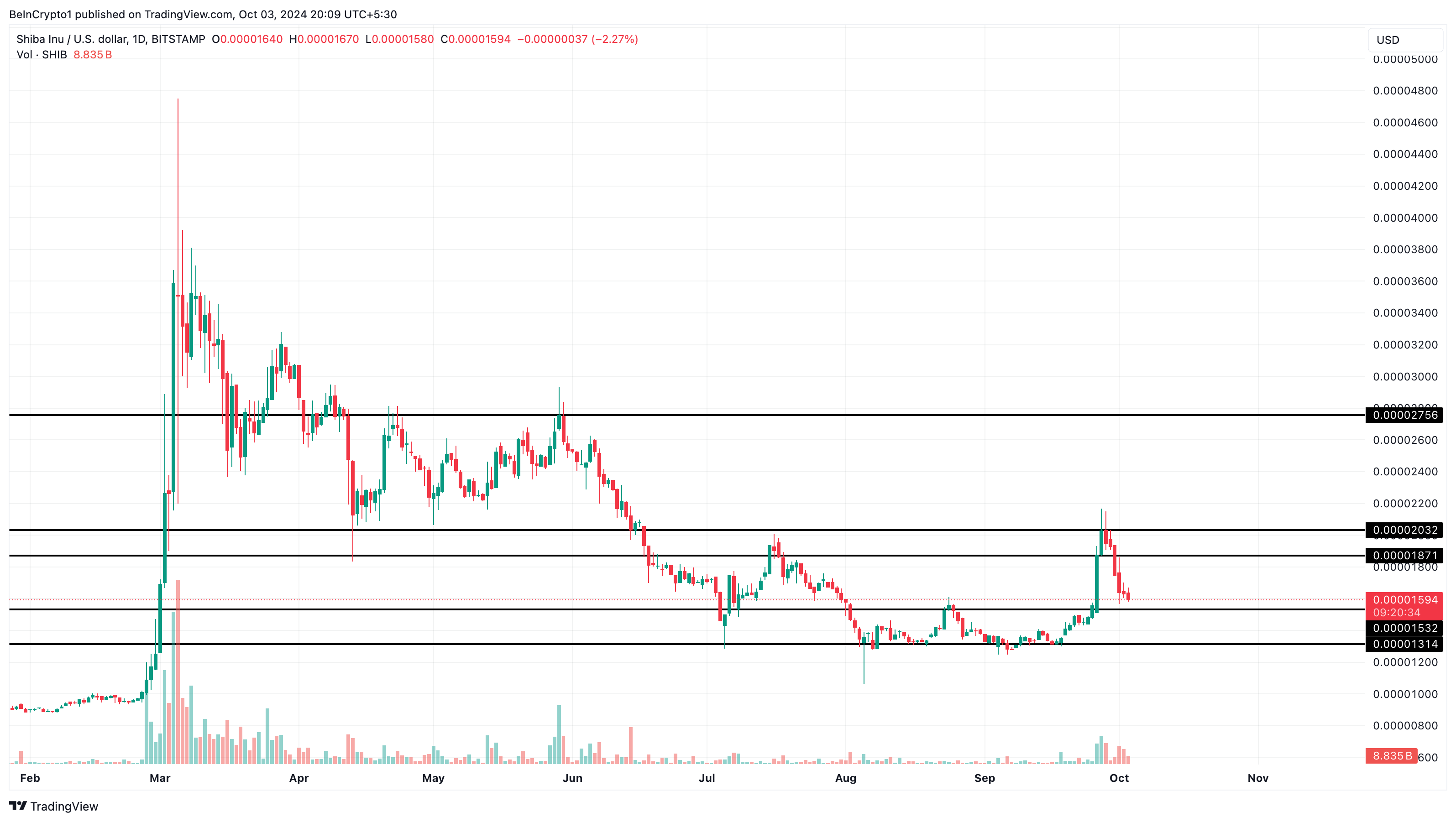 Baseado no gráfico diário, o preço do SHIB está se aproximando da linha de suporte em US$ 0,000015. A pressão de venda, conforme indicado pelo volume, não é tão intensa quanto antes. Se isso permanecer assim, então a cripto pode evitar uma tendência de baixa prolongada.
