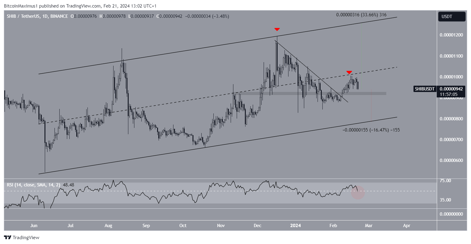 O período diário fornece uma perspectiva indeterminada devido à ação do preço e ao RSI. A ação do preço mostra que o SHIB saiu de uma linha de tendência de baixa. No entanto, ainda é negociada na parte inferior de um canal paralelo de alta de longo prazo, uma vez que a sua linha média o rejeitou em 14 de fevereiro.