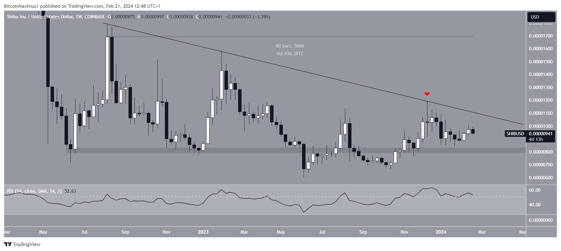 A análise técnica do gráfico semanal mostra que a Shiba Inu caiu sob uma linha de tendência de baixa desde agosto de 2022. A linha causou várias quedas de preço, a mais recente em dezembro de 2023 (ícone vermelho). Essa linha de tendência existe há 560 dias.