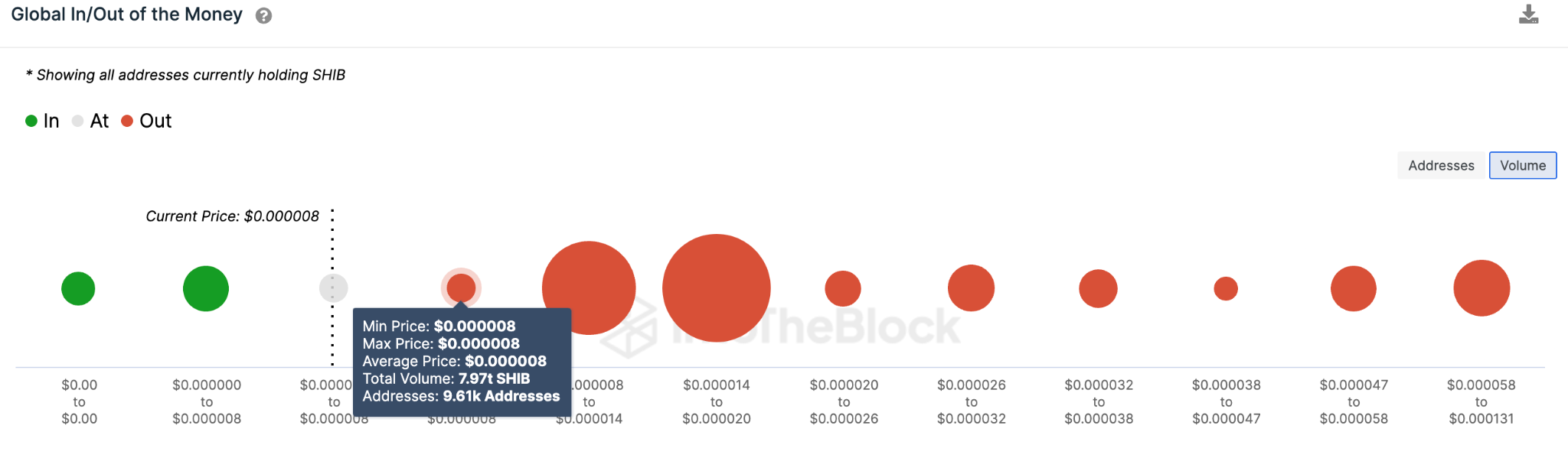Considerando a atividade otimista das baleias, a SHIB provavelmente chegará a US$ 0,000009 nas próximas semanas. No entanto, os dados globais do In/Out of The Money Around Price (IOMAP) do IntoTheBlock sugerem que a memecoin enfrentará resistência inicial em torno de US$ 0,0000085.