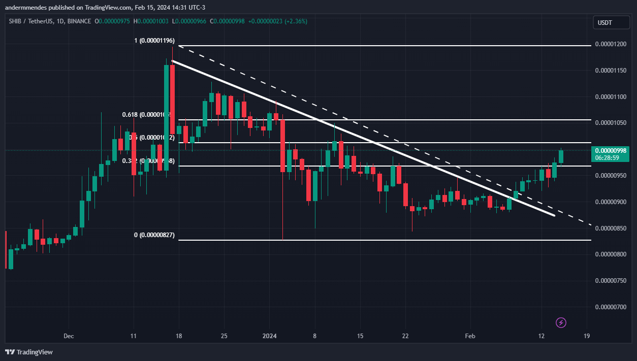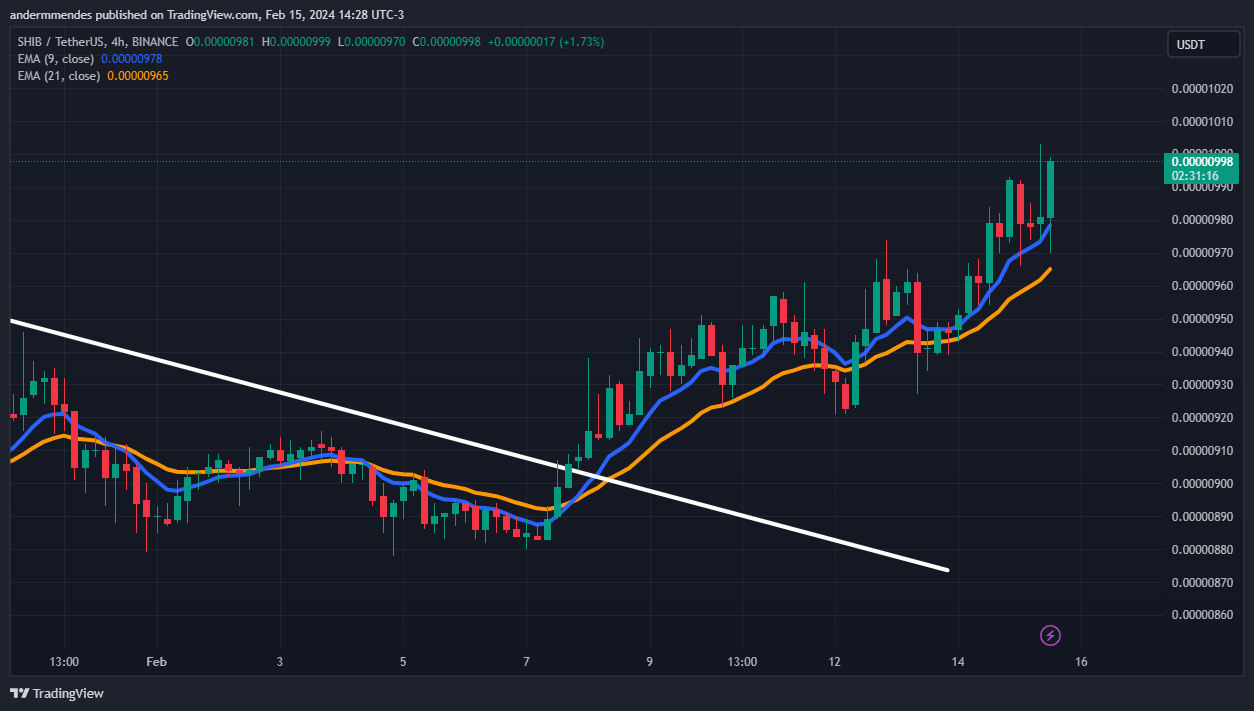 A Shiba Inu (SHIB) rompeu uma linha de tendência de baixa em 8 de fevereiro, formando um topo mais alto que o anterior desde então.