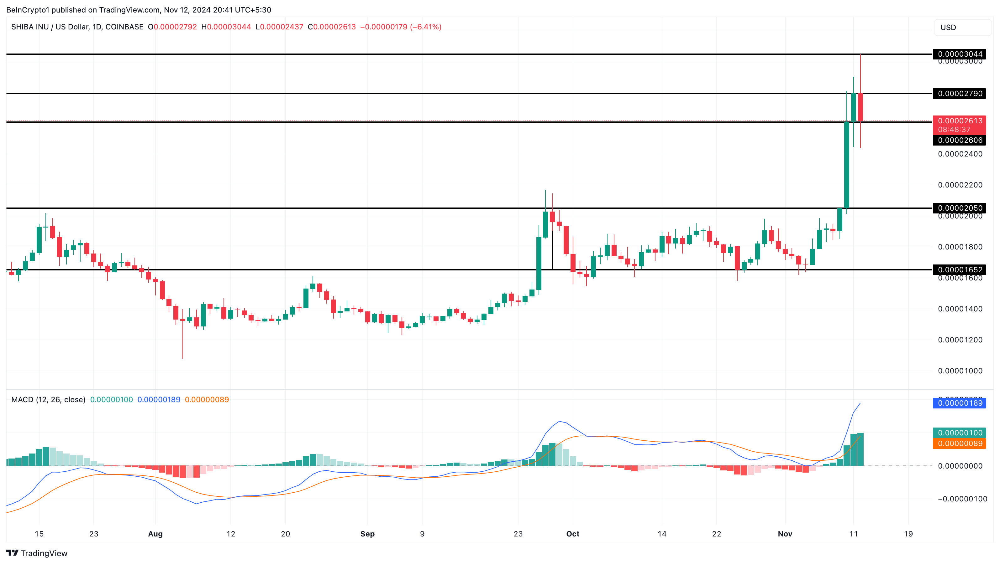 Nesta terça-feira (12), o preço da SHIB disparou para US$ 0,000030, com especulações de que o token poderia atingir um novo topo anual. Mas isso não ocorreu, já que o preço caiu para US$ 0,000025.