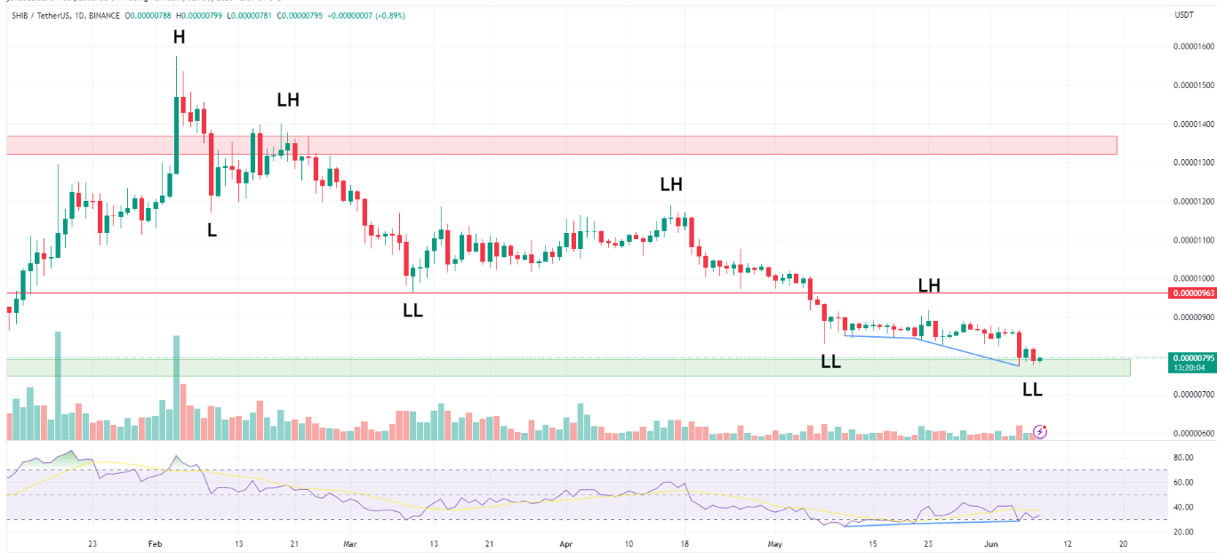 A análise do gráfico diário mostra uma clara tendência de queda. Essa tendência está em andamento desde o topo local de US$ 0,00001575 no início de fevereiro de 2023. Mais tarde, o preço da SHIB gerou 3 topos mais baixos consecutivos (LH) e 3 fundos mais baixos (LL).